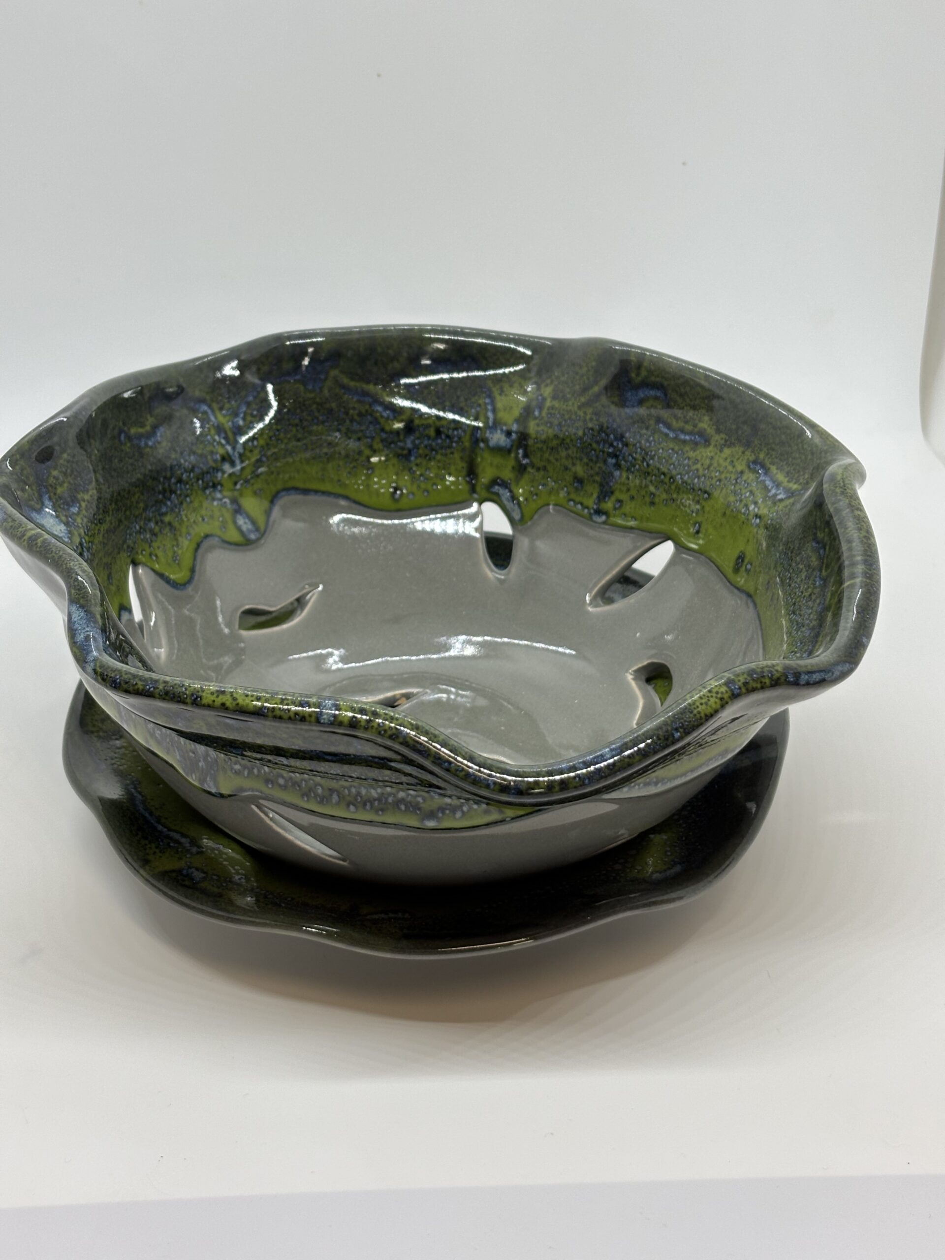This is a two piece set consisting of a bowl (8 1/2″ diameter x 3 ” tall) with holes for rinsing and a plate for it to go back to. It is designed to rinse strawberries , cherries to name a few . Great for leaving fruit out of the table because it is aerated with the holes.