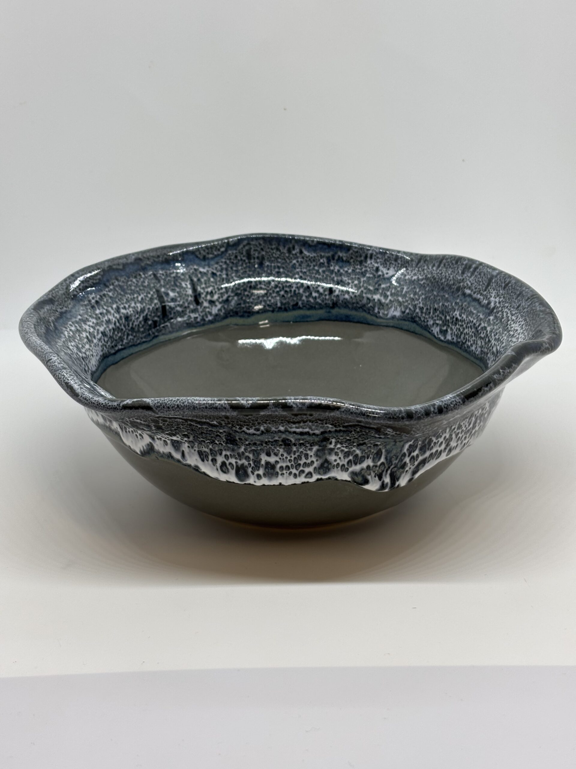This is a fun bowl which is great for serving veggies, salad, popcorn to name a few. It measures 9″ in diameter and stands 3 1/2″ high. It is decorated in our popular River Rock.